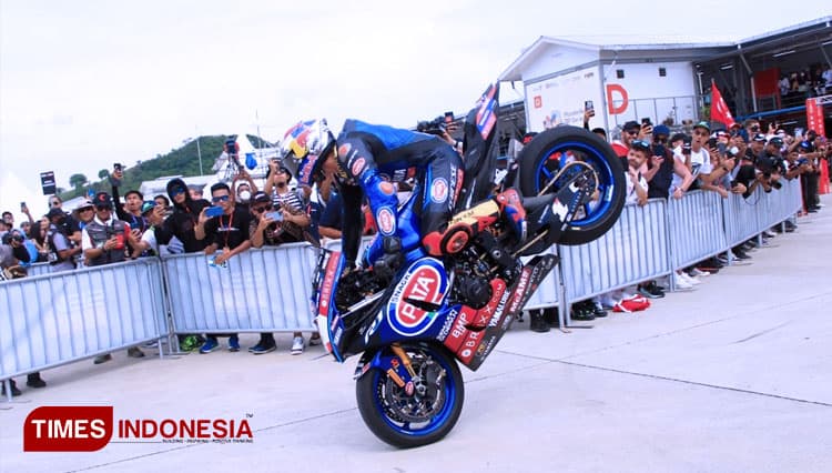 Pembalap PATA Yamaha Brixx Toprak Razgatlioglu melakukan atraksi stopie ban depan usai memenangi race 1 WSBK Mandalika 2022, Sabtu (12/11/2022). (FOTO: Tria Adha/TIMES Indonesia).