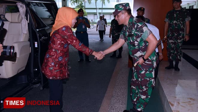 Pangdam V/Brawijaya, Mayjen TNI Wisnoe, P.B, menyambut kedatangan Gubernur Jatim, Khofifah Indar Parawansa di Makodam V/Brawijaya, Rabu (20/2/2019).(Foto: Istimewa)